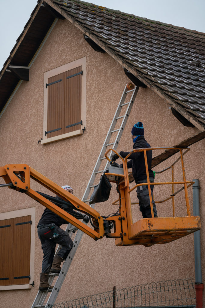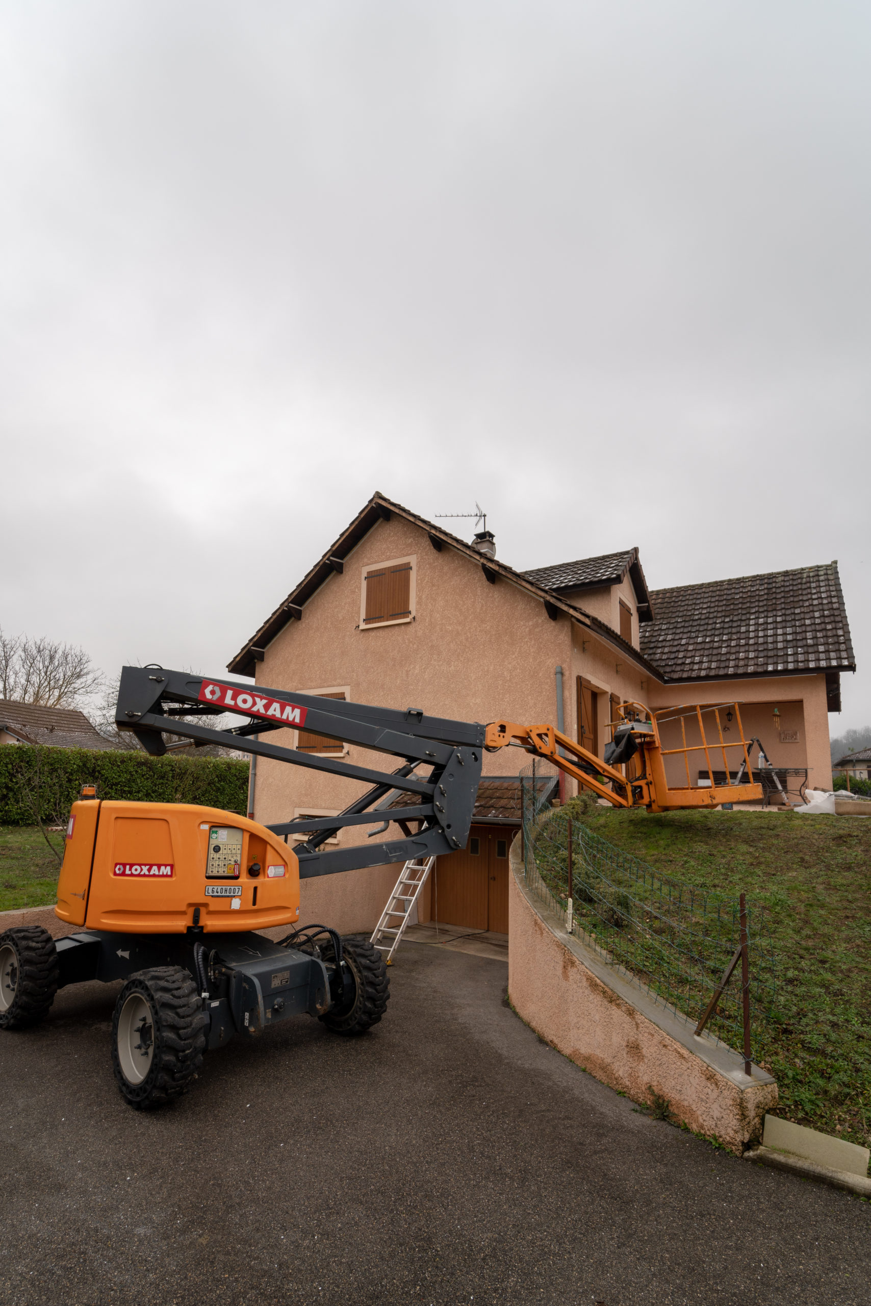 Intervention réalisée à la nacelle 4×4 pour atteindre les pignons à plus de 7m de haut.